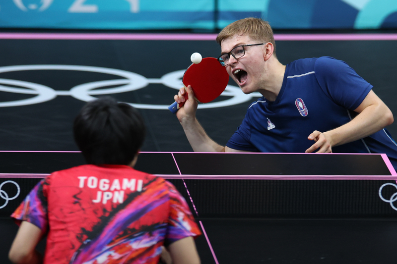 新华社照片,巴黎,2024年8月9日\n 8月9日,法国队选手艾利克斯·勒布伦(右)在比赛中。他1比3不敌日本选手队户上隼辅。\n 当日,在巴黎奥运会乒乓球男团铜牌赛中,法国队3比2战胜日本队,获得铜牌。\n 新华社记者 刘续 摄
