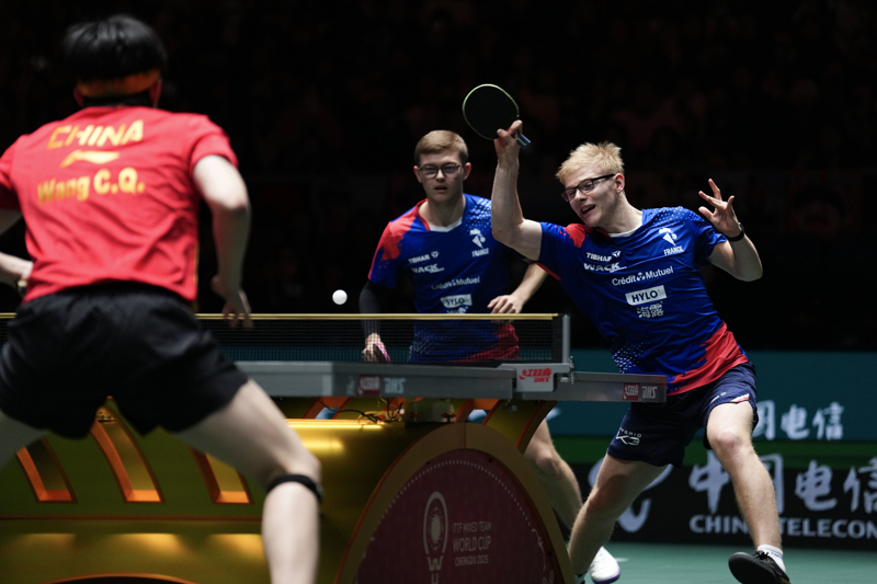 新华社照片,成都,2025年12月4日\n 12月4日,法国队组合艾利克斯·勒布伦/费利克斯·勒布伦(右)在男双比赛中。他们0比1不敌中国队组合王楚钦/林诗栋。\n 当日,在四川成都举行的2025年国际乒联混合团体世界杯第二阶段比赛中,中国队总比分8比2战胜法国队。\n 新华社记者 王迎 摄