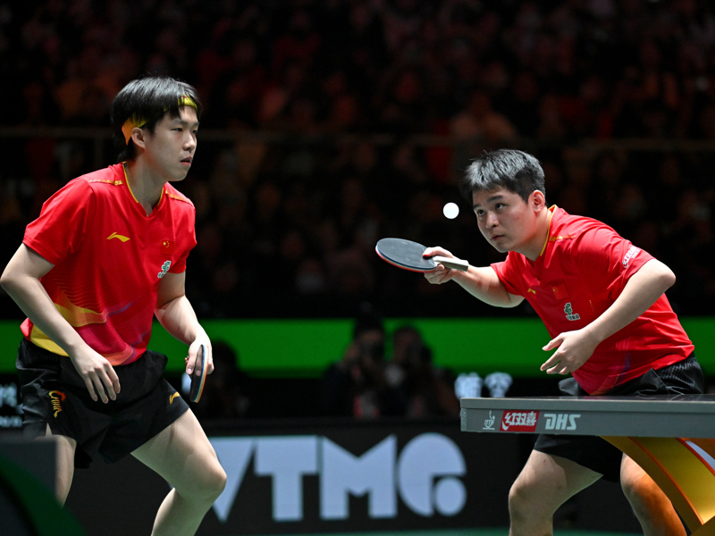 新华社照片,成都,2025年12月4日\n 12月4日,中国队组合王楚钦/林诗栋(右)在男双比赛中。他们1比0战胜法国队组合艾利克斯·勒布伦/费利克斯·勒布伦。\n 当日,在四川成都举行的2025年国际乒联混合团体世界杯第二阶段比赛中,中国队总比分8比2战胜法国队。\n 新华社记者 胥冰洁 摄